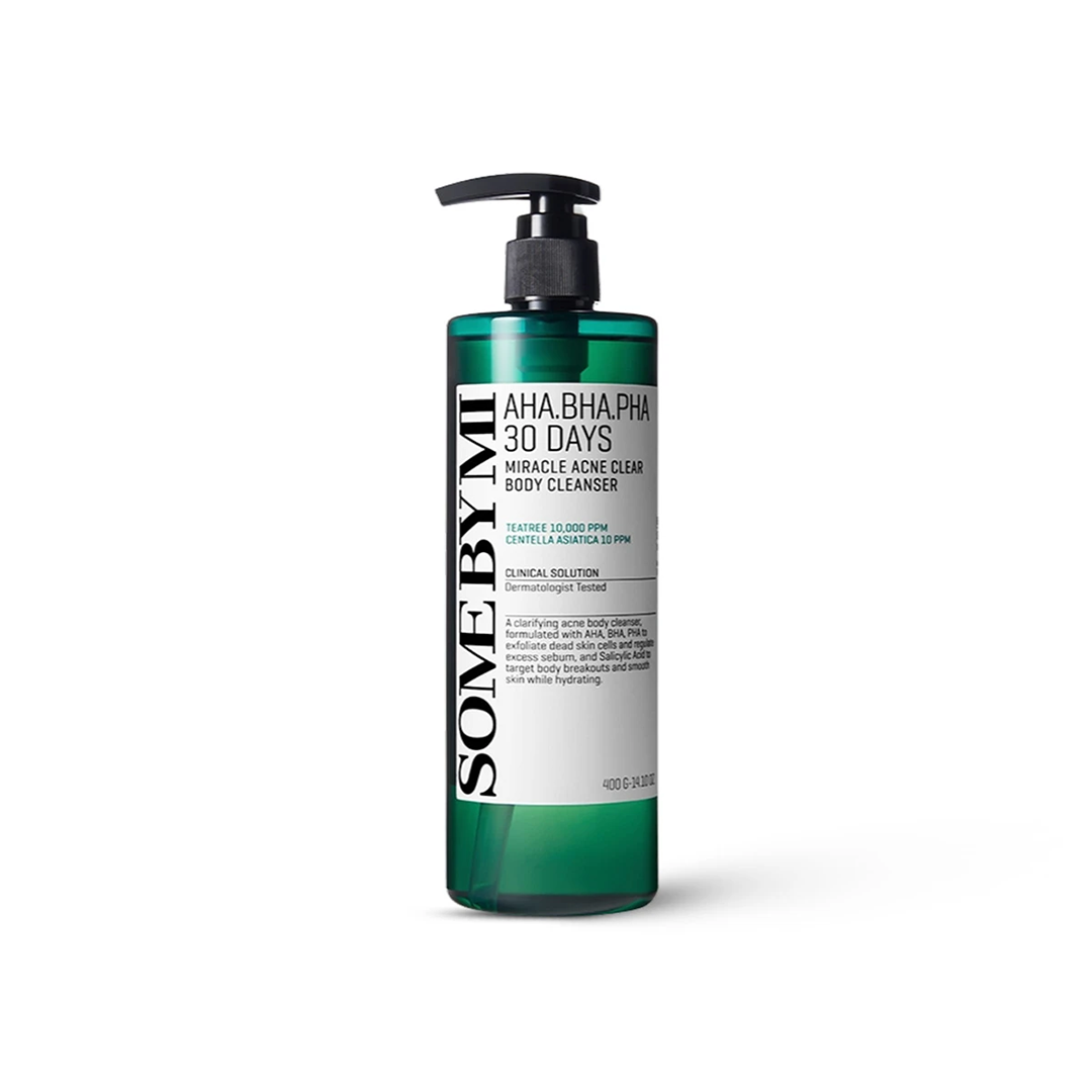 Struggling with body acne, backne, or clogged pores? Meet your new shower essential – SOME BY MI AHA BHA PHA 30 Days Miracle Acne Clear Body Cleanser. Specially formulated to combat acne and excess oil on the body, this Korean skincare favorite uses a blend of AHA, BHA, and PHA acids to exfoliate dead skin cells, unclog pores, and prevent future breakouts.Infused with Truecica™, 10,000ppm of Tea Tree Leaf Extract, and soothing plant-based ingredients, this body wash deeply cleanses while calming inflamed skin.